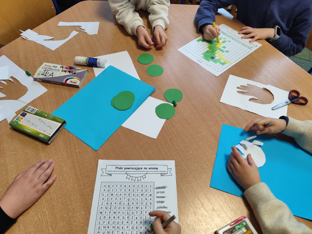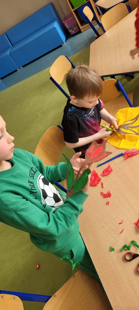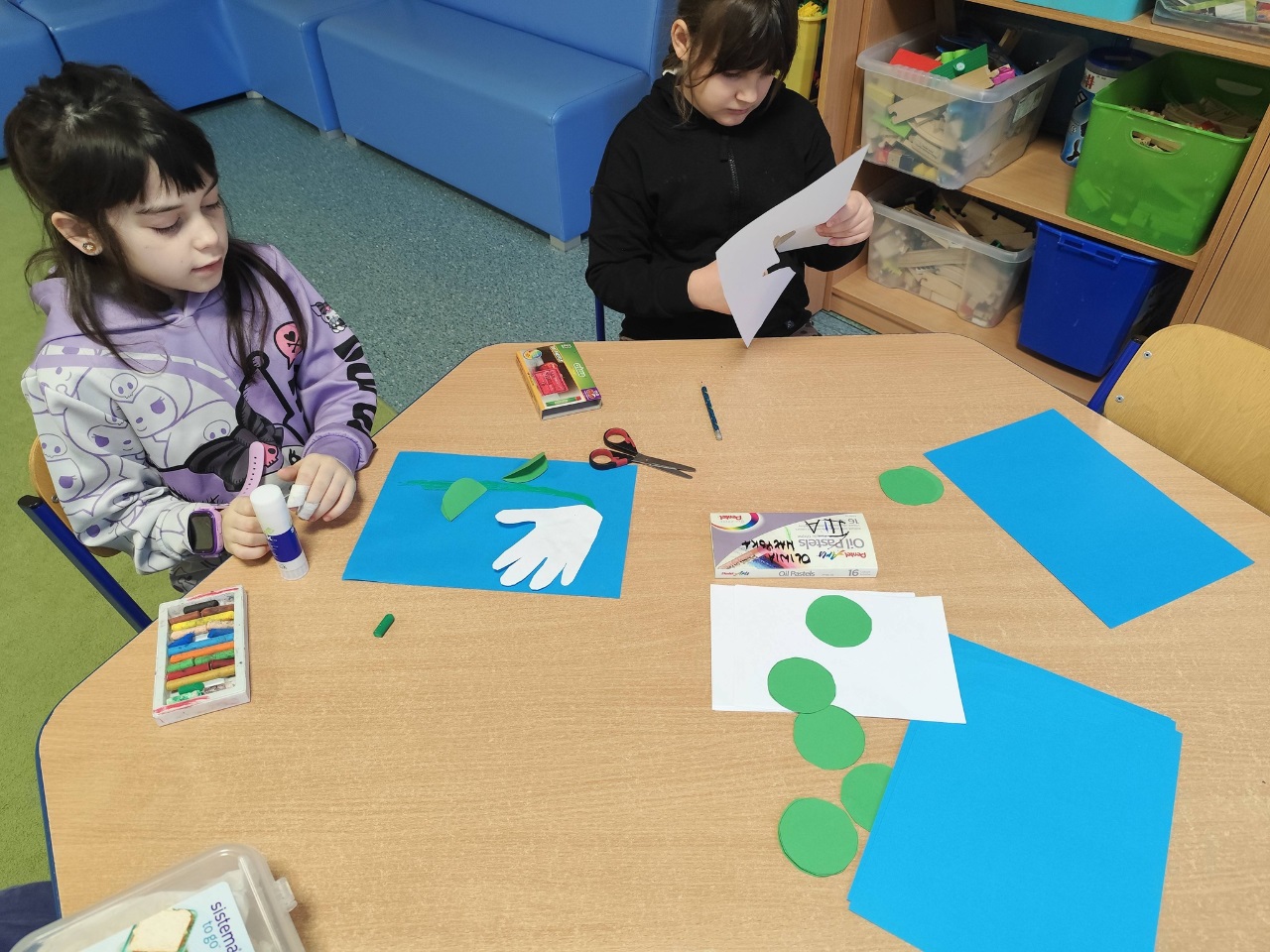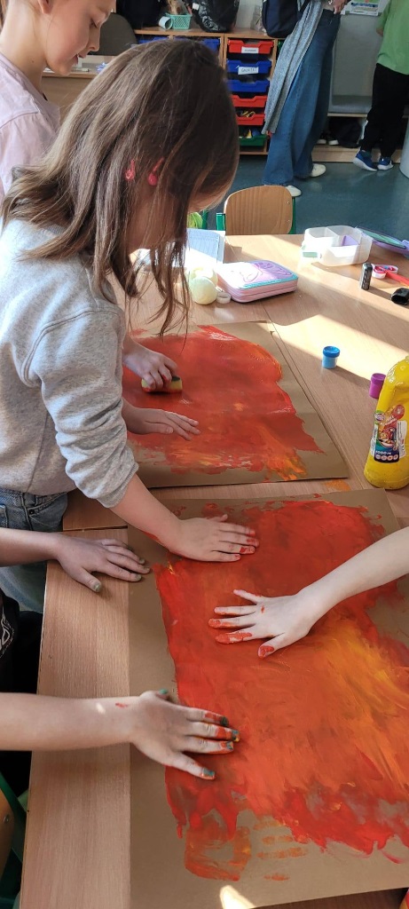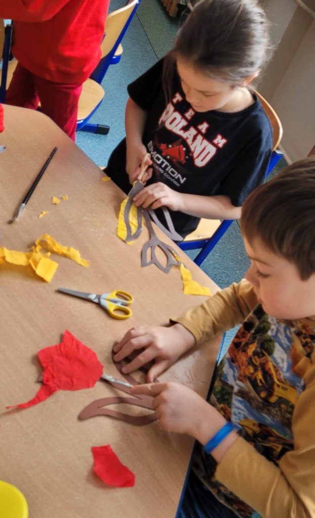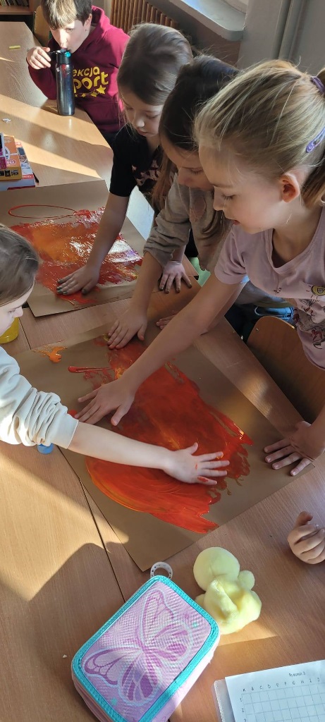 . Wspólnie stworzyliśmy dużą pracę plastyczną przedstawiającą prehistoryczny krajobraz. To była świetna okazja do rozmów o dawnych czasach i rozwijania wyobraźni!