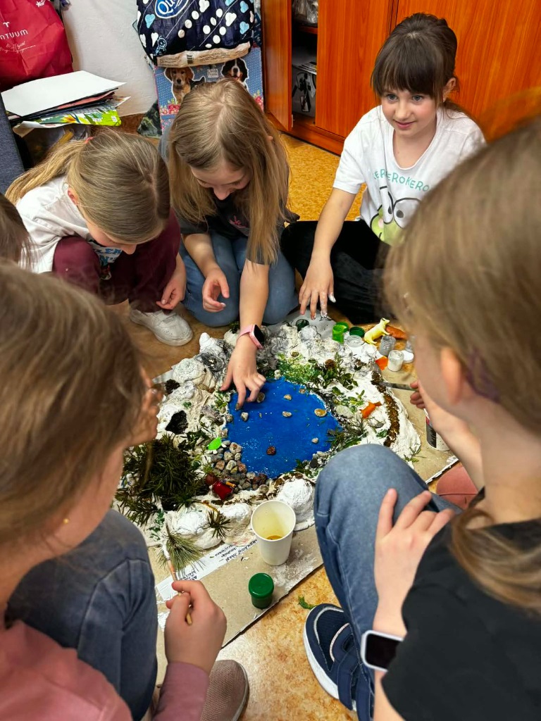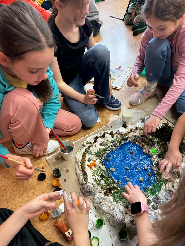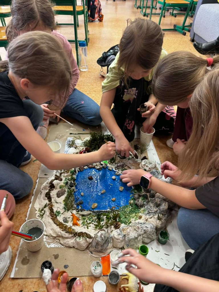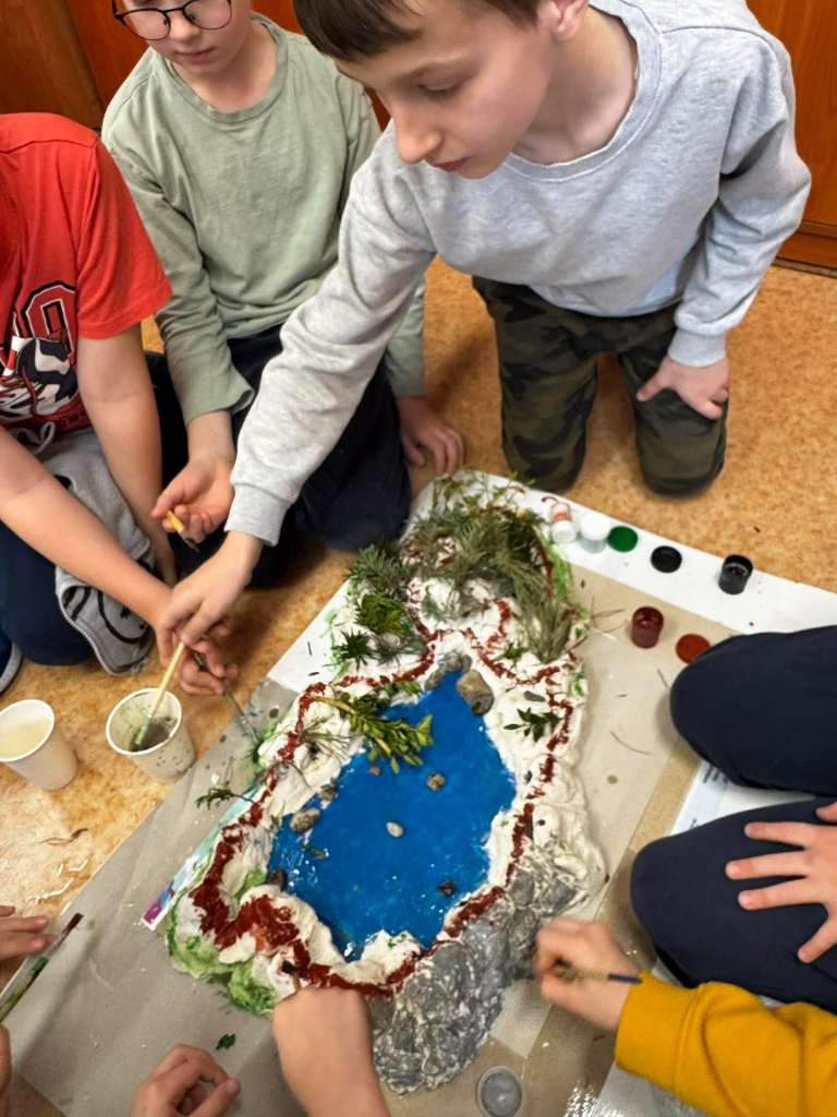 Następnie, pracując w dwóch grupach podczas dwóch spotkań, dzieci przystąpiły do wykonania makiet gór. Wspaniale się przygotowały, a ich zaangażowanie i współpraca były naprawdę godne podziwu.