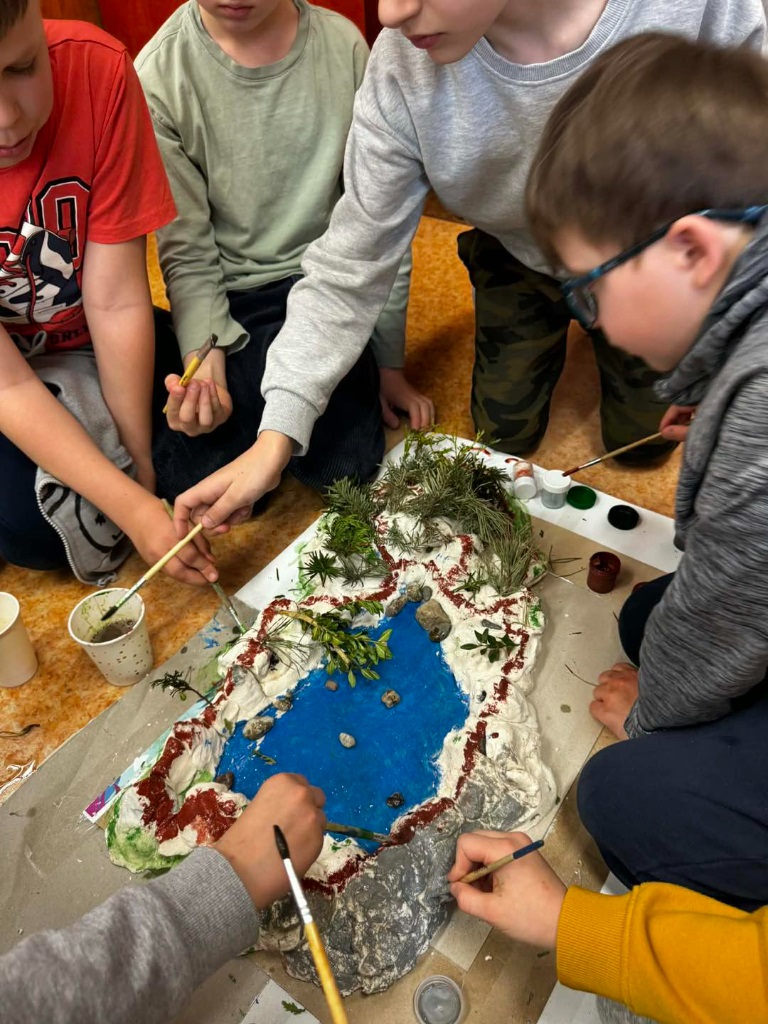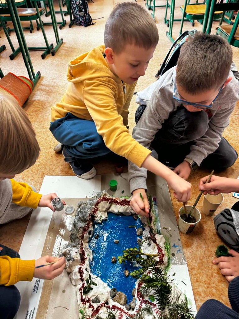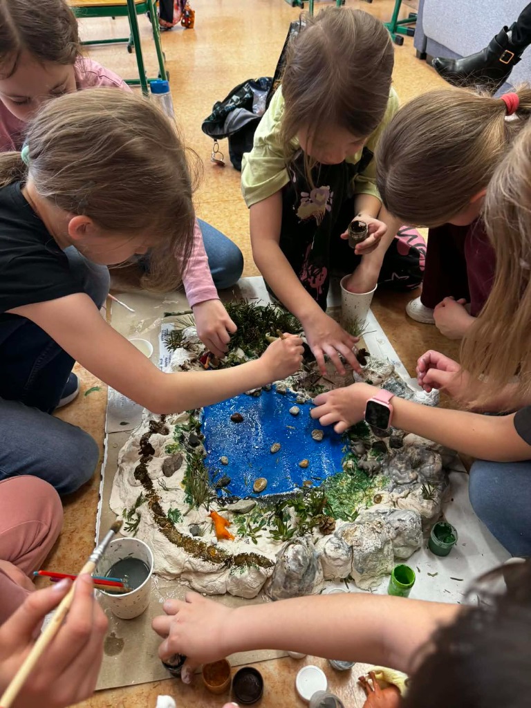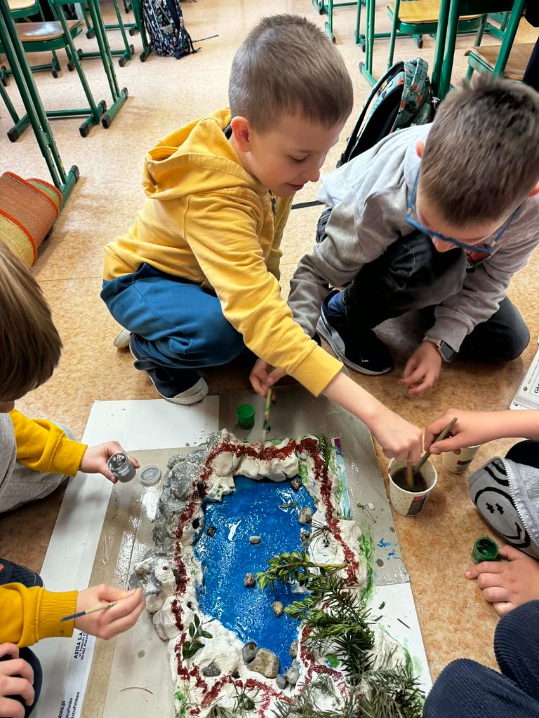 Następnie, pracując w dwóch grupach podczas dwóch spotkań, dzieci przystąpiły do wykonania makiet gór. Wspaniale się przygotowały, a ich zaangażowanie i współpraca były naprawdę godne podziwu.