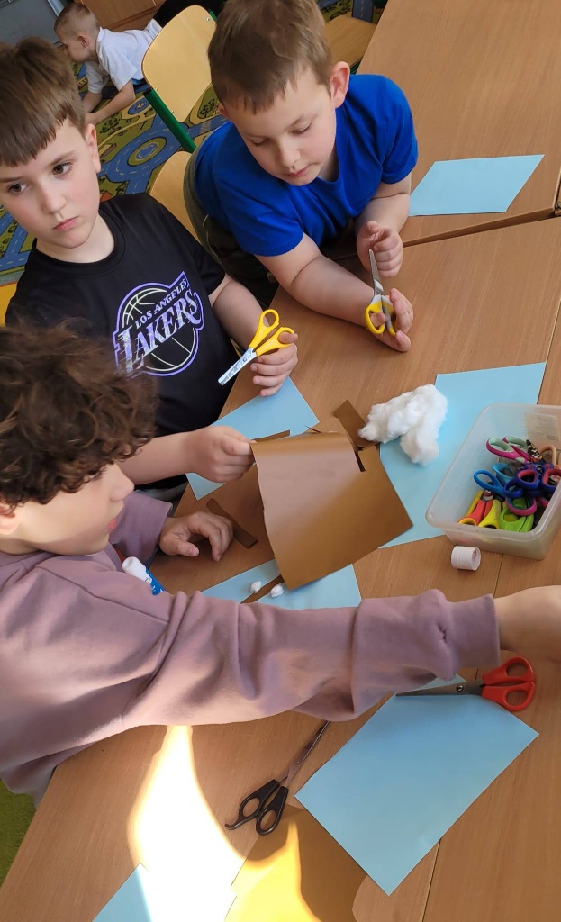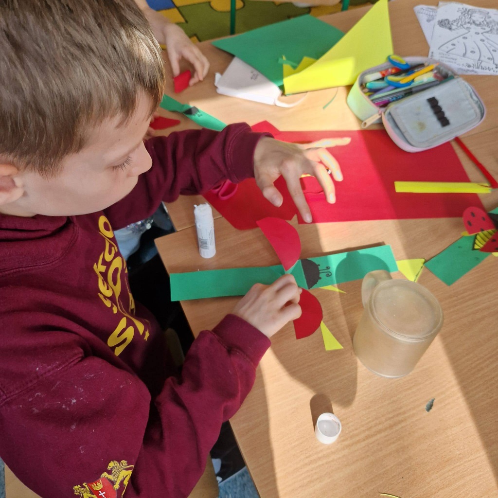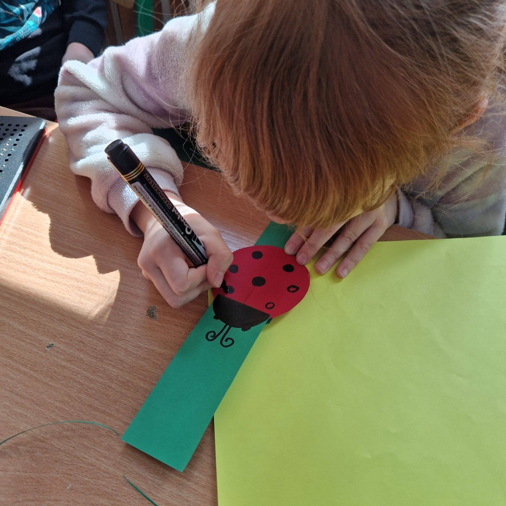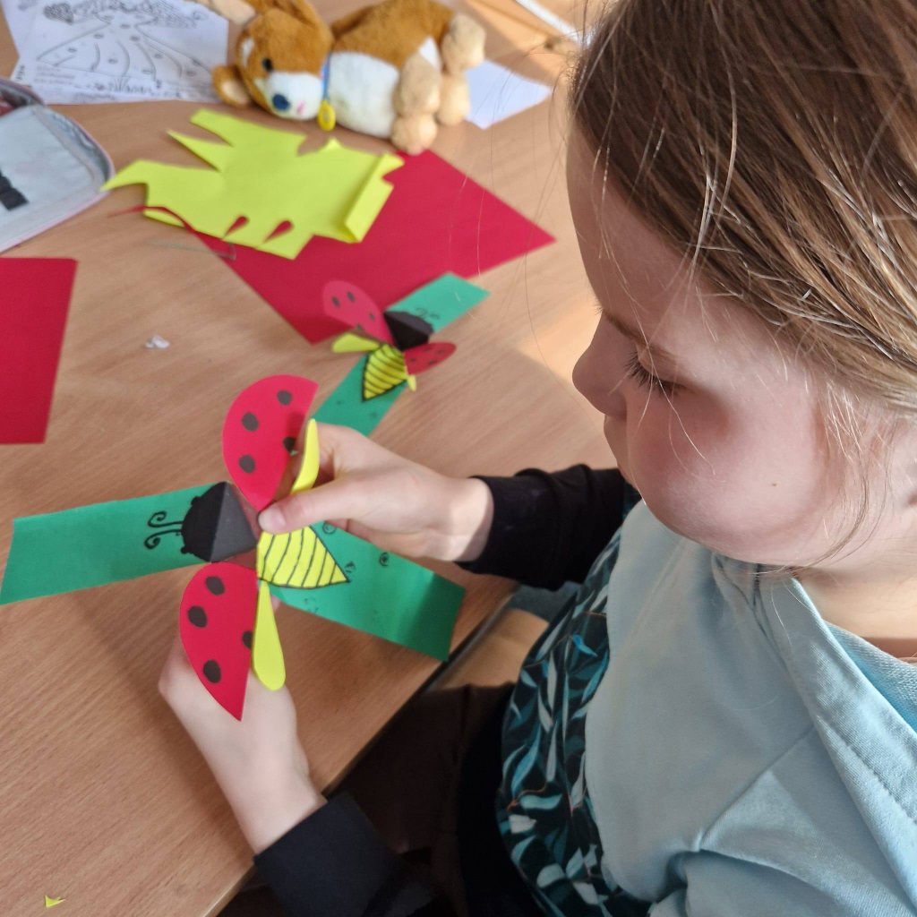 Nie zabrakło również czasu na zabawy w grupie i swobodne aktywności – dzieci tworzyły z koralików oraz uczyły się wykonywać ruchome prace plastyczne z owadami.