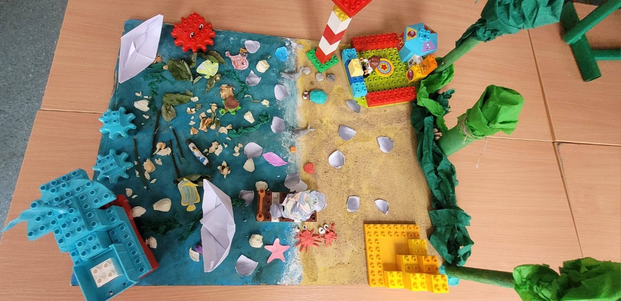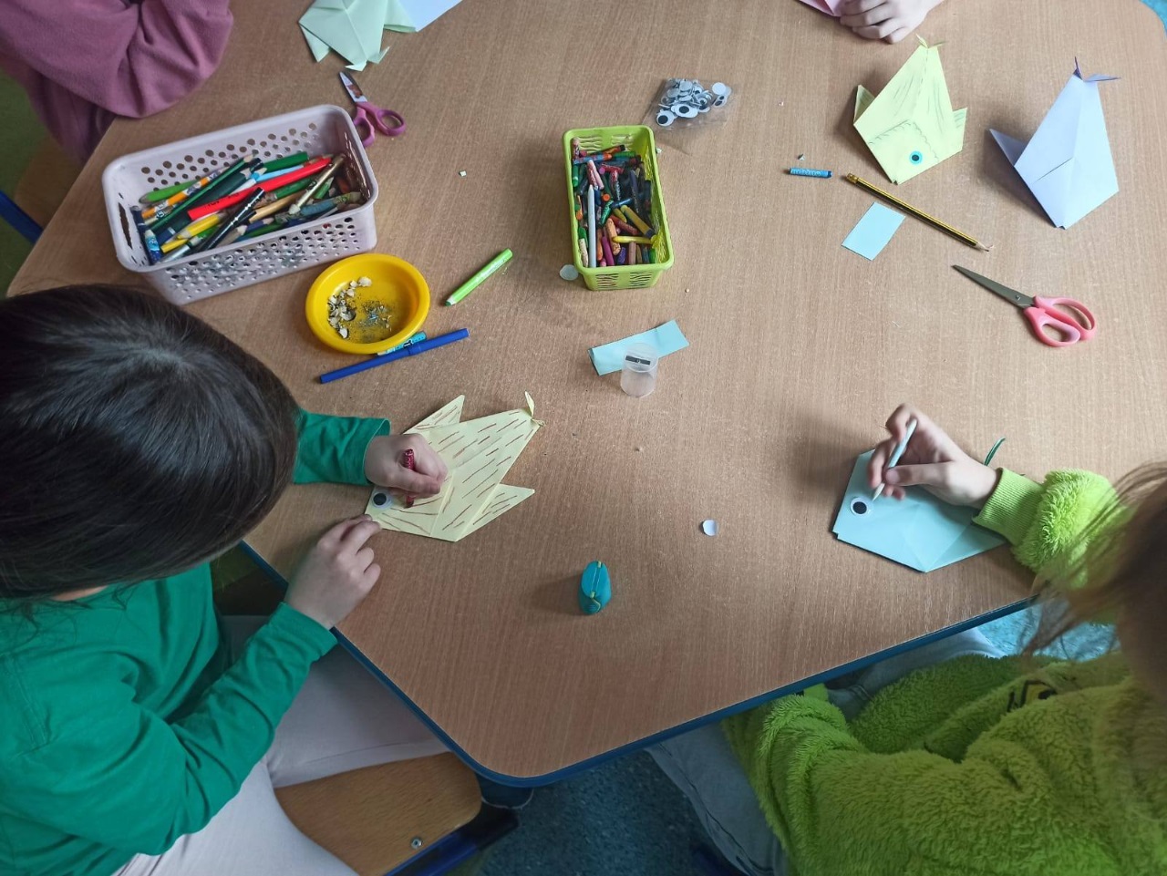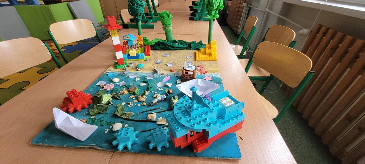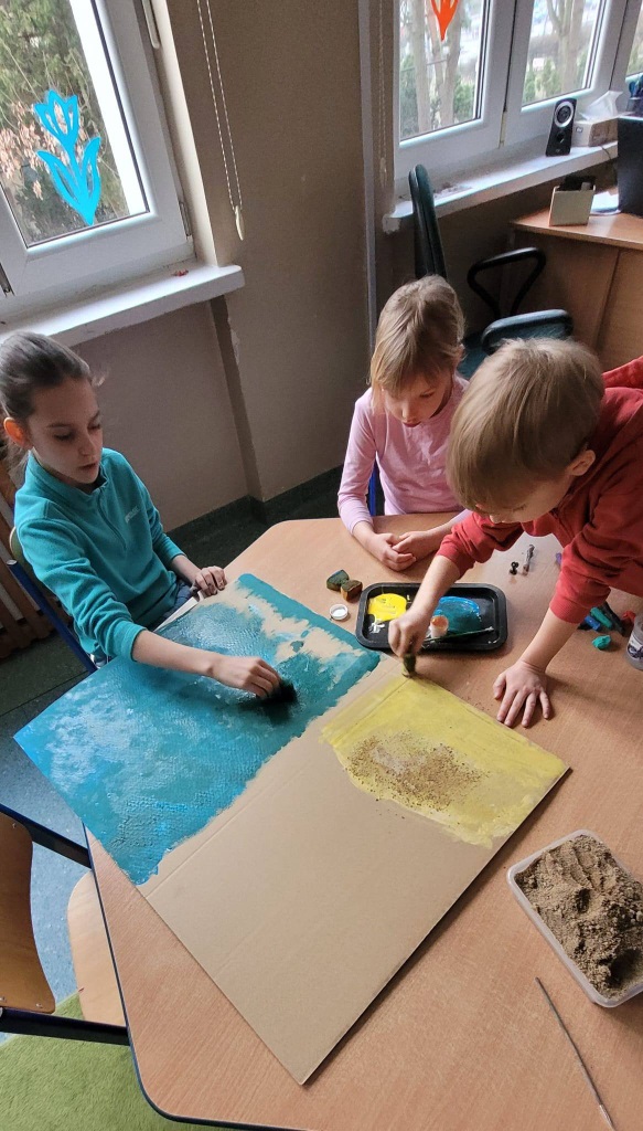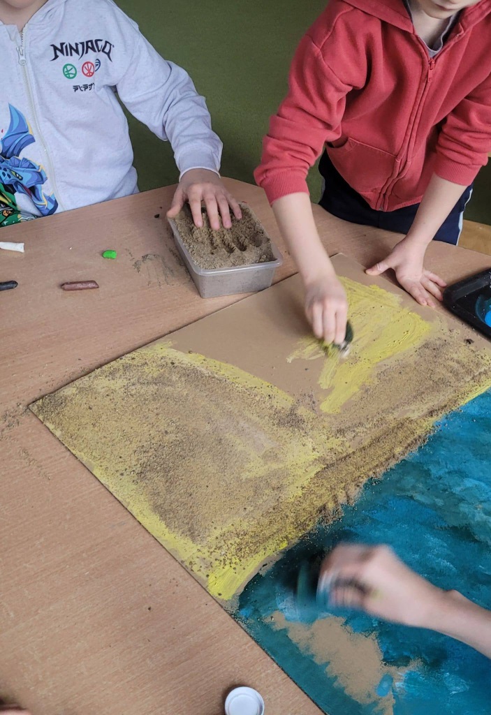 Najpierw przenieśliśmy się nad morze – dzieci tworzyły kolorowe rybki z origami, makietę miasteczka nadmorskiego oraz wyjątkowe pejzaże zachodzącego słońca nad morzem z wykorzystaniem papierowych talerzyków.