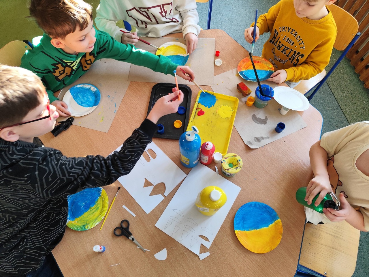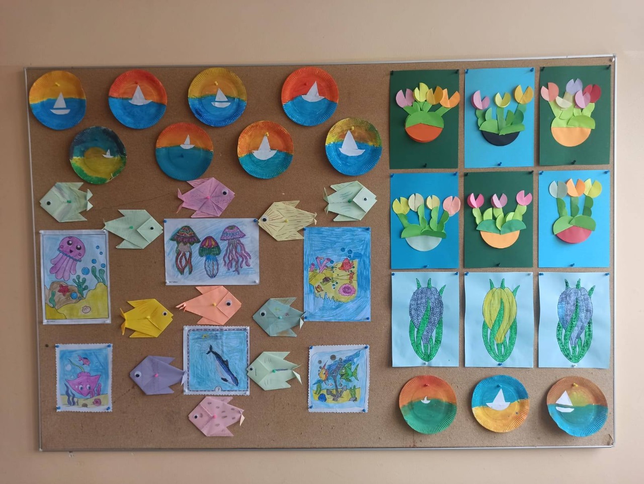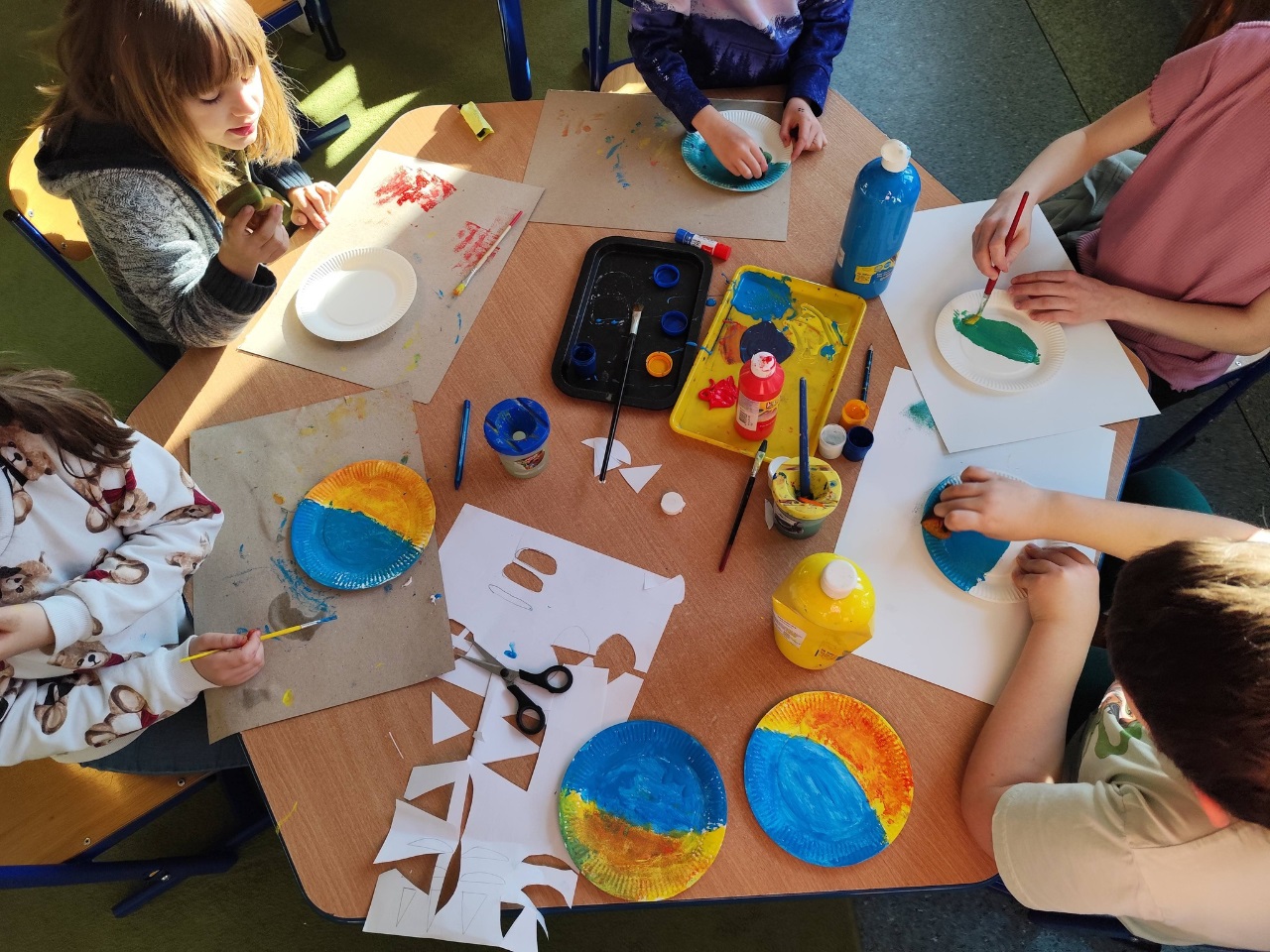 Najpierw przenieśliśmy się nad morze – dzieci tworzyły kolorowe rybki z origami, makietę miasteczka nadmorskiego oraz wyjątkowe pejzaże zachodzącego słońca nad morzem z wykorzystaniem papierowych talerzyków.
