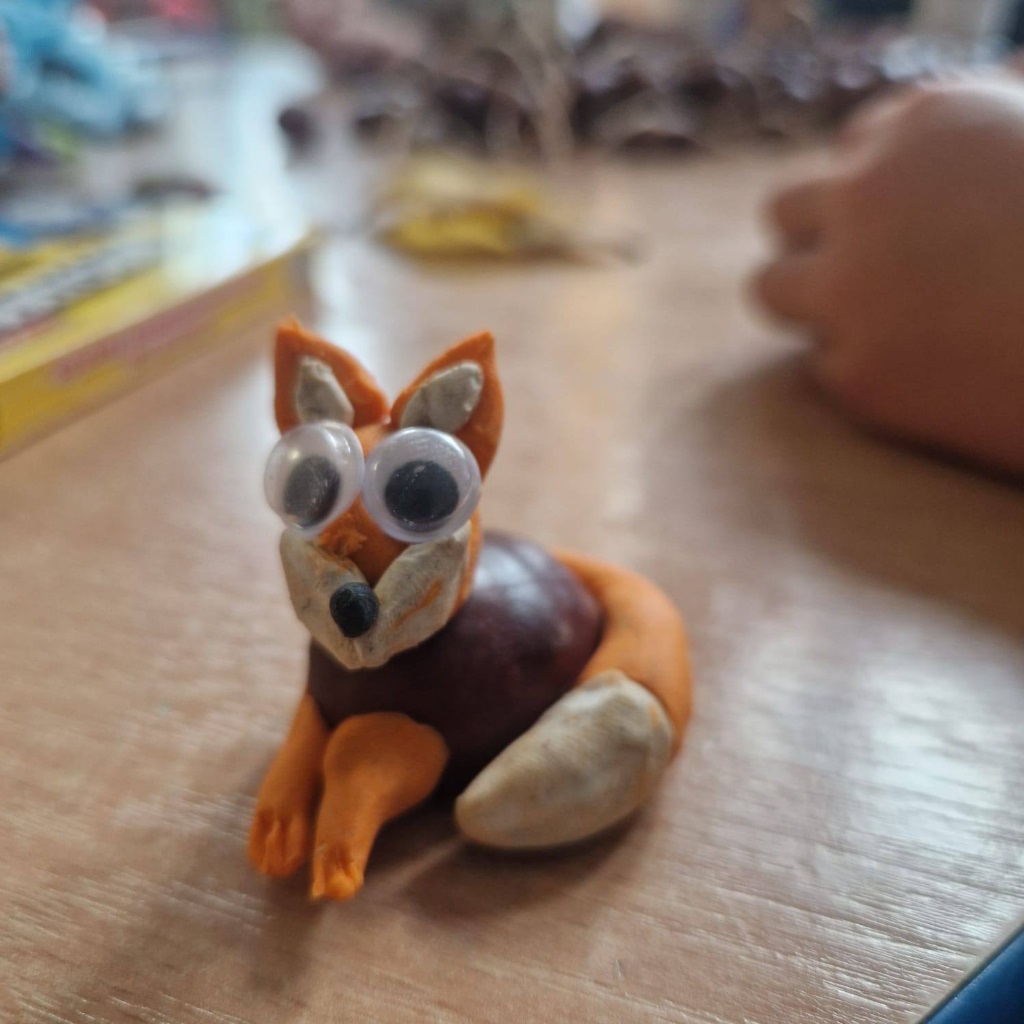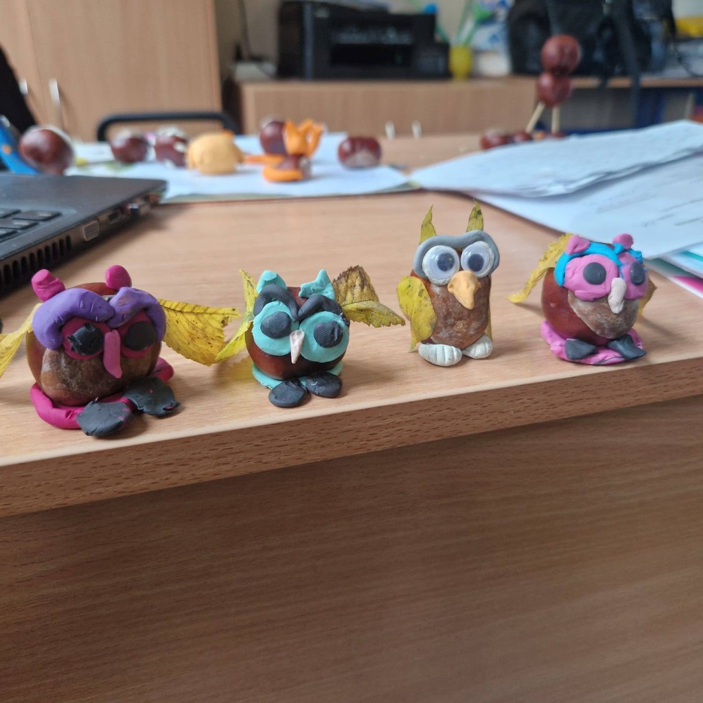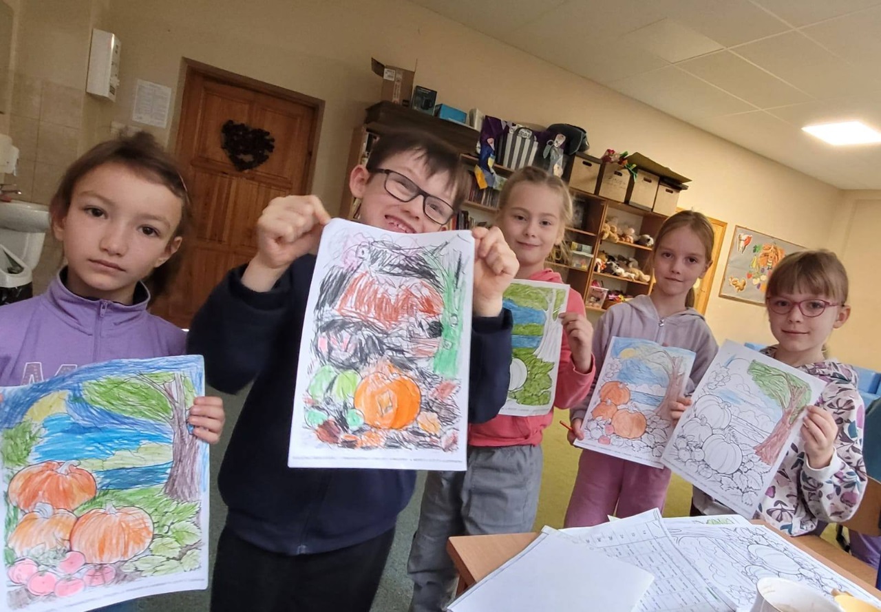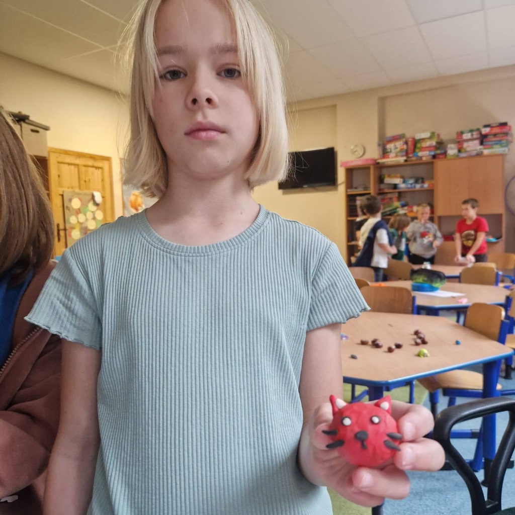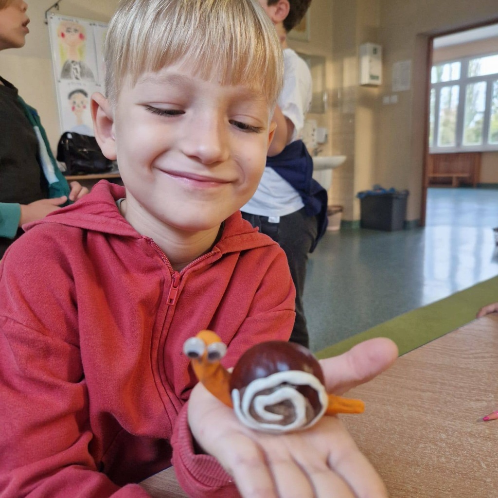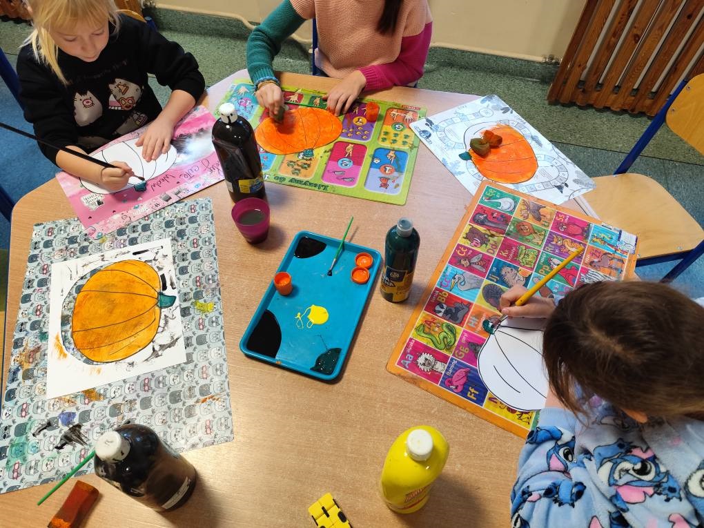 Dzieci tworzyły piękne prace plastyczne – malowały farbami jesienne grzyby, dynie oraz lepiły wesołe figurki z plasteliny, łącząc je z kasztanami.