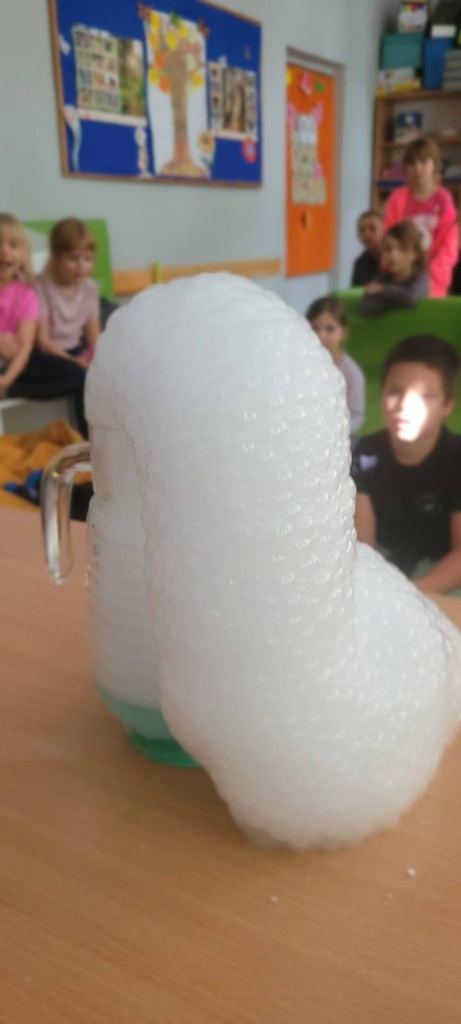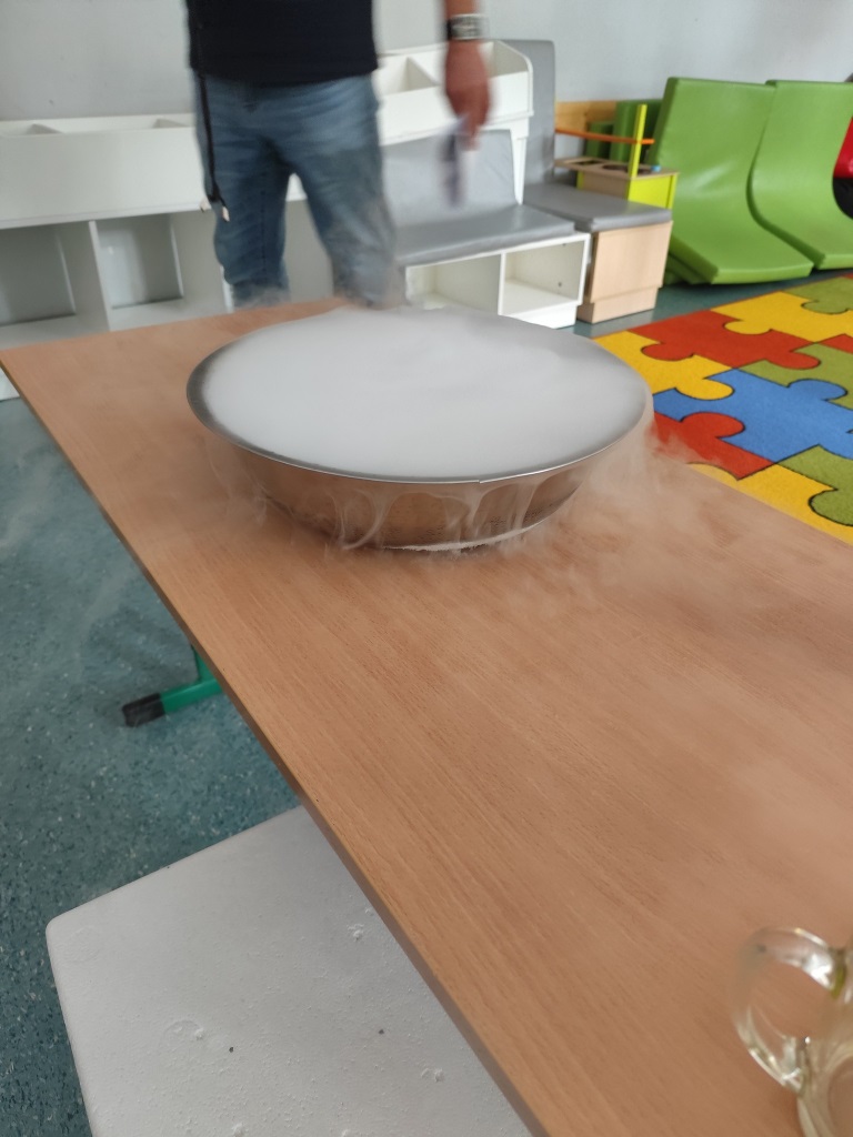 Dużą atrakcją był także eksperyment z wykorzystaniem suchego lodu, który wzbudził ogromne zainteresowanie i wiele pytań małych odkrywców.
