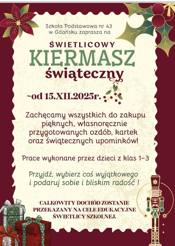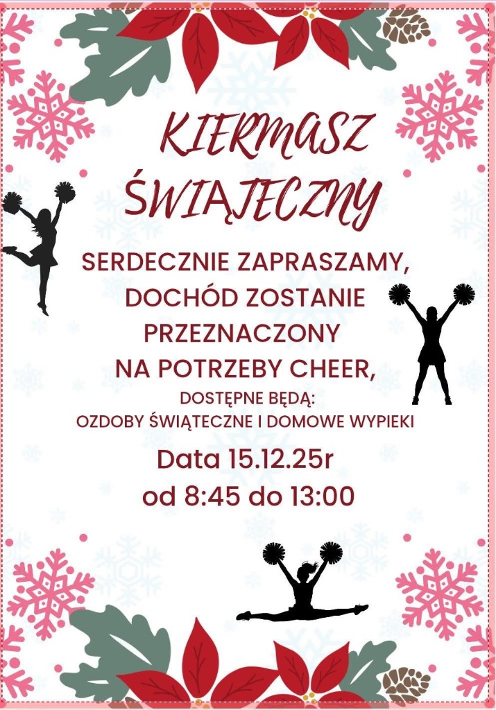 Kiermasz przygotowany przez świetlicę, a na nim ozdoby świąteczne i kiermasz przygotowany przez rodziców grupy Cheerleaders, serdecznie zapraszamy